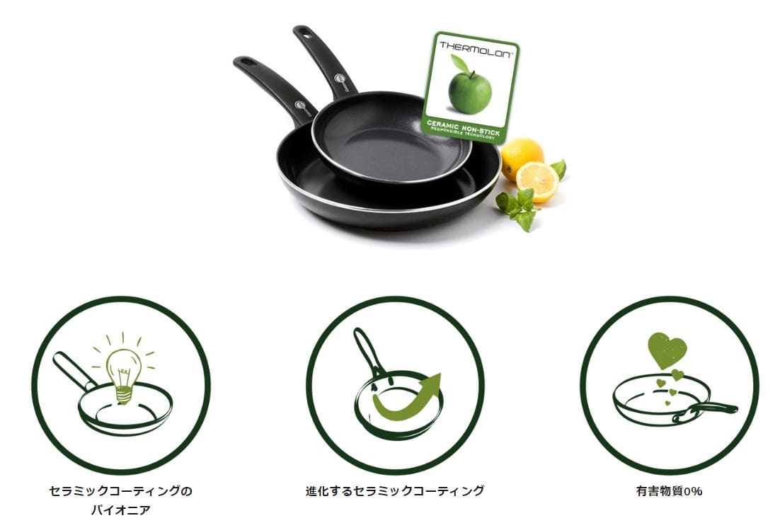 もちろん、セラミックフライパンのリーディングカンパニーであるグリーンパンの安心さはそのまま。 小さな火で調理できてエコ、お手入れもしやすく、素材をおいしく仕上げます。
