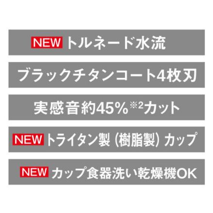 の2種の形状の刃を組み合わせたブラックチタンコート4枚刃で、砕き残りが