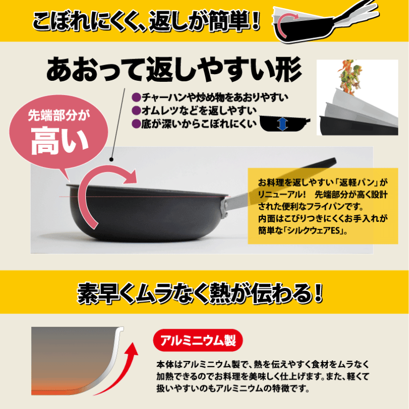 先端部分が高く設計された便利なフライパンです。