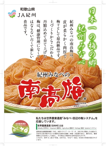 6月に完熟した南高梅を丁寧に収穫し、約1ヶ月の間塩漬けした梅を、天日干して美味しい梅干しが出来上がります。南高梅は果肉が厚くて皮が柔らかいのが特徴です。