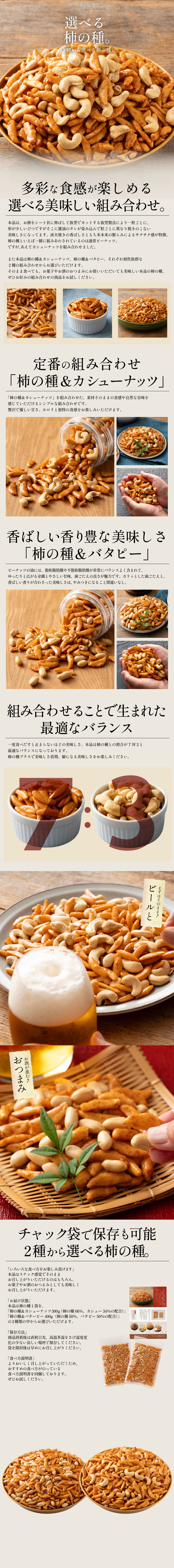 | 原材料/素材/材質 | カシューナッツ(ベトナム産)、柿の種 米(タイ産、国産)、醤油、水飴、砂糖、醤油調味料、唐辛子/加工デンプン、調味料(アミノ酸等)、アナトー色素、増粘剤(加工デンプン)、酸味料、ビタミンB1、(一部に小麦・大豆・鶏肉を含む) |