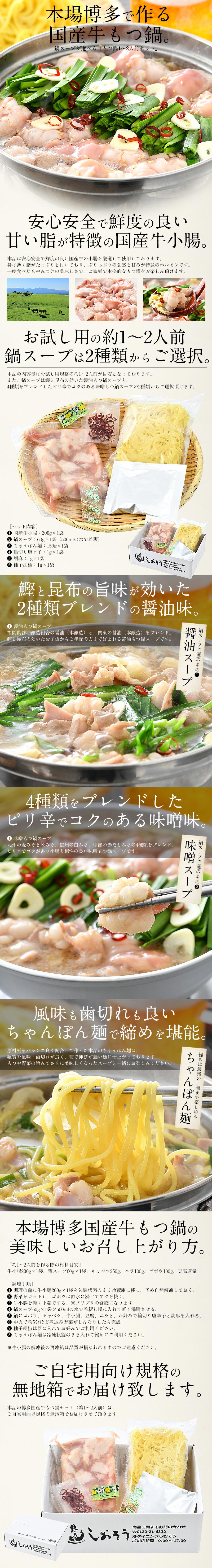 | 原材料/素材/材質 | 牛小腸(国産)、 鍋スープ・醤油(醤油(国内製造)、かつおだし、発酵調味料、みりん、昆布エキス、還元水飴、食塩、カツオエキス、砂糖/調味料(アミノ酸等)、酒精、(一部に小麦・大豆を含む))、 ちゃんぽん麺(小麦粉(国内製造)、澱粉、粉末卵白、植物性蛋白、食塩/かんすい、焼成カルシウム、クチナシ色素(一部に小麦・卵を含む))、輪切り唐辛子(中国産)、胡麻(白ごま)、柚子胡椒(ゆず皮(国産)、青唐辛子、食塩) |