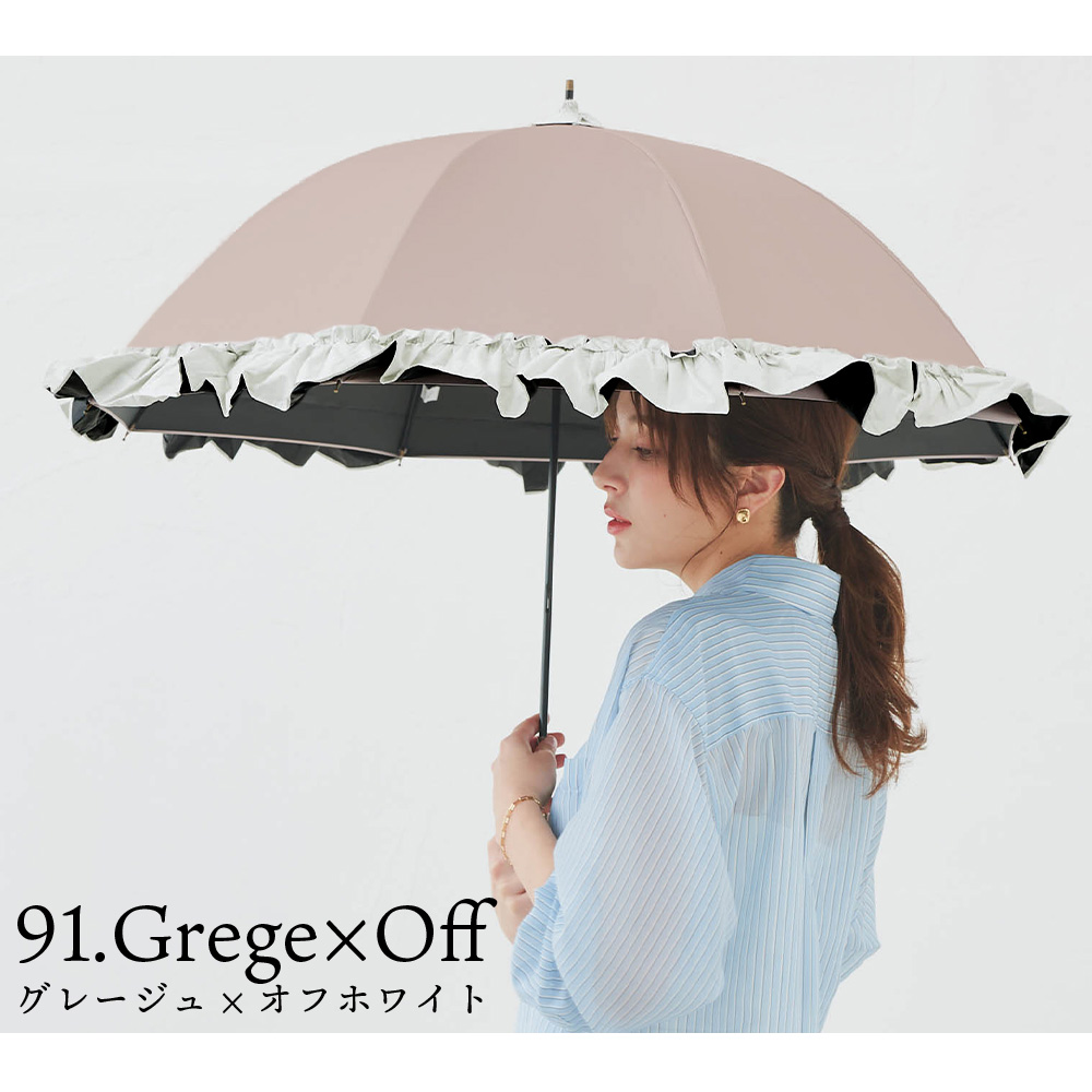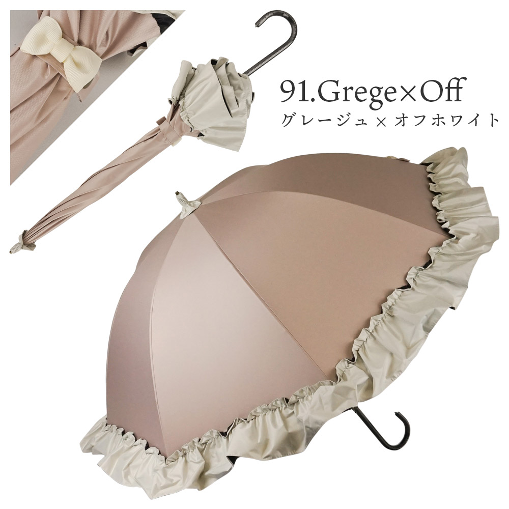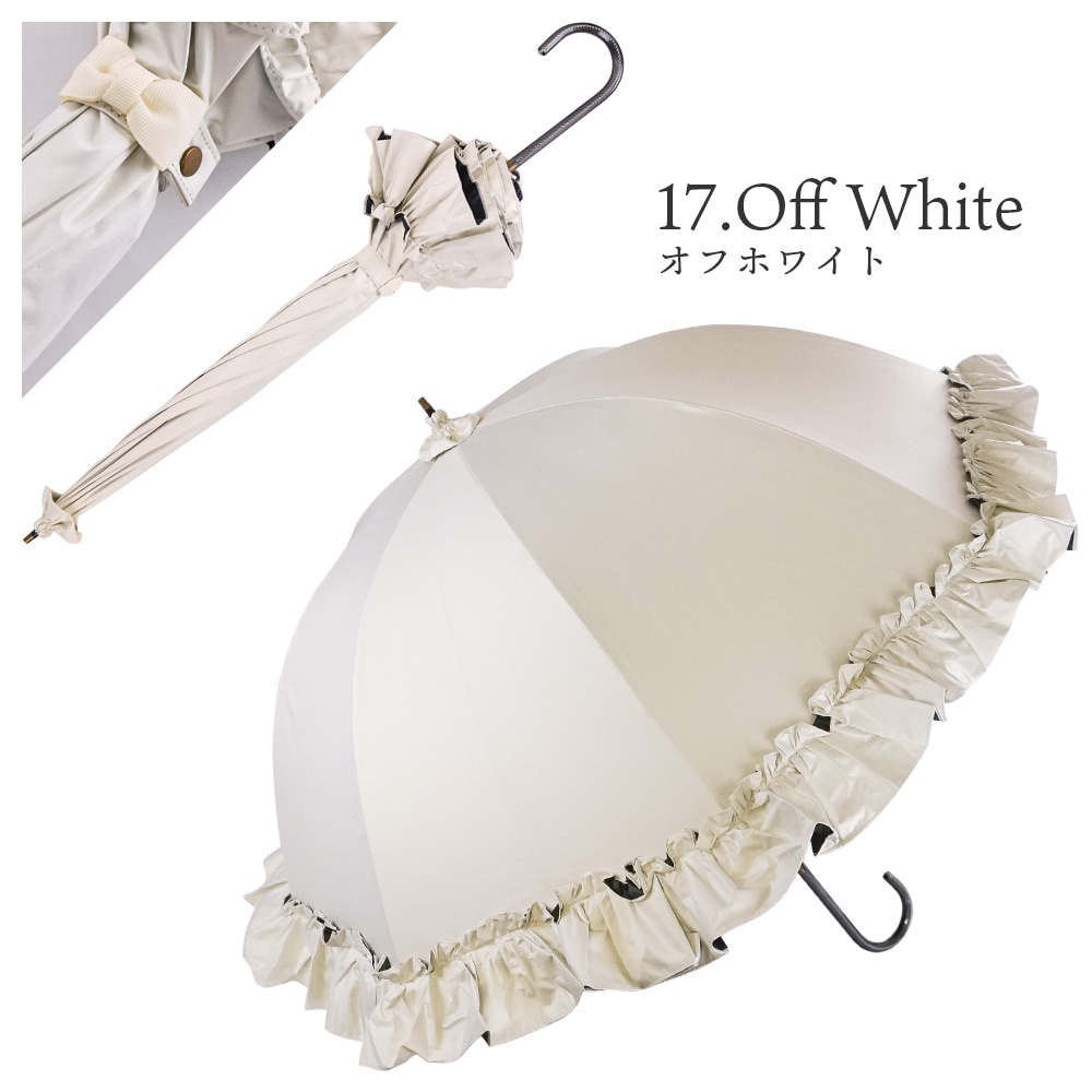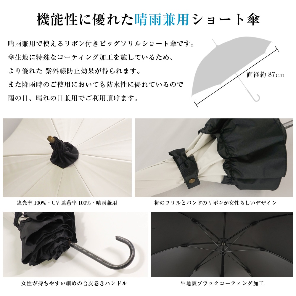 | その他詳細 1 | 晴雨兼用で使えるリボン付きビッグフリルショート傘です。 裾のフリルとバンドのリボンが女性らしいデザインです。細めのハンドルで手の小さな女性でも持ちやすくなっています。 傘生地に特殊なコーティング加工を施しているため、より優れた 紫外線防止効果が得られます。 また、降雨時のご使用においても防水性に優れているので雨の日、晴れの日兼用でご利用頂けます。 |