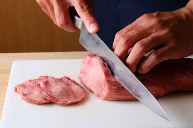 磨かれた牛たんは食べ応えのある厚さにスライス。手振りで塩などの味付けをし、ていねいにタワーのように積み上げられ、しばし熟成のための眠りにつきます。その作業のほとんどを手作業で行います。