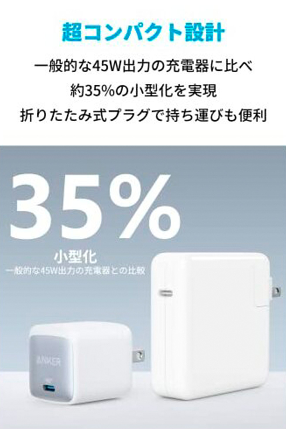 | その他詳細 1 | 入力:100-240V~1.87A 50-60Hz約68g 出力:5.0V=3.0A /9.0V=3.0A / 15.0V=3.0A / 20.0V=2.25A (最大45W) | PPS出力 : 3.3V-16.0V=3.0A / 3.3V-21.0V=2.25A (最大45W) |