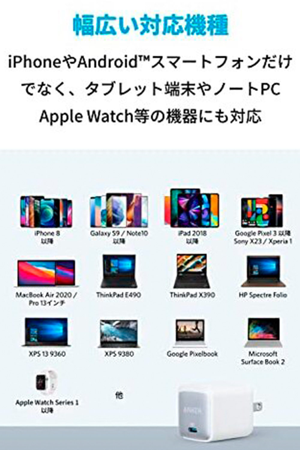 iPhoneやiPad、MacBook、Apple WatchなどのApple製品を含む、幅広い機器へフルスピード充電できます。
