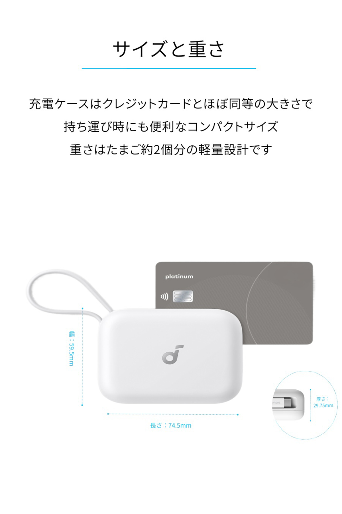 充電ケースはクレジットカードとほぼ同等の大きさで持ち運び時にも便利なコンパクトサイズ、重さはたまご約2個分の軽量設計です。
