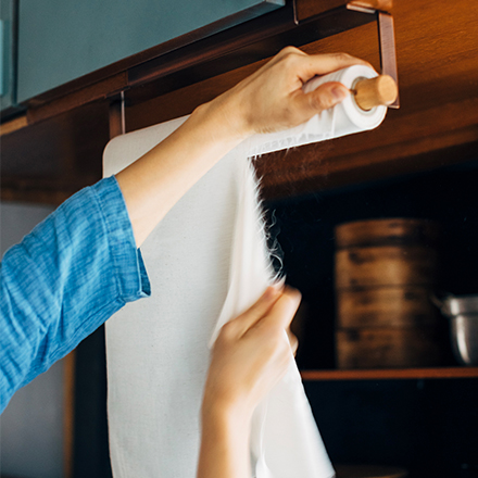 キッチンの棚などに吊るして設置でき、晒を切り取る際に指で押さえやすいように設計しました。