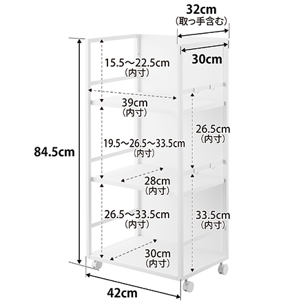 | サイズ/寸法 | 約幅420x奥行321x高さ845mm(キャスター含む) 内寸サイズ:下段:W39×D30×H26.5~33.5cm 中段:W39×D28×H19.5~26.5~33.5cm 上段:W39×D28×H15.5~22.5cm |
