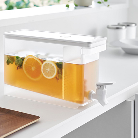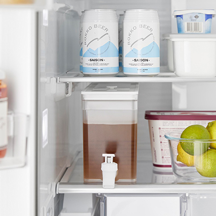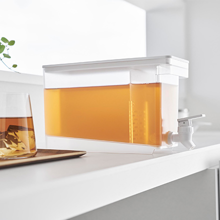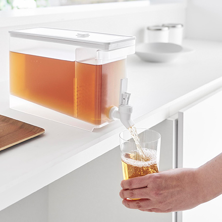 冷蔵庫に入れたまま、レバーを上下に倒すだけで冷たいお茶を簡単に注げるコンパクトなドリンクサーバー。