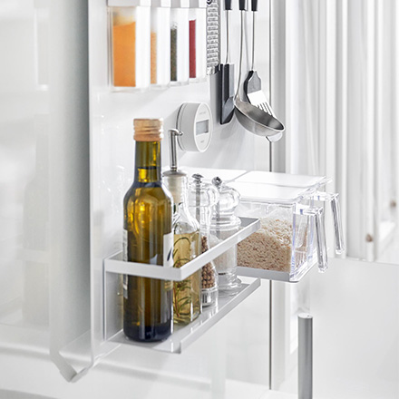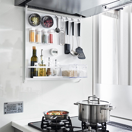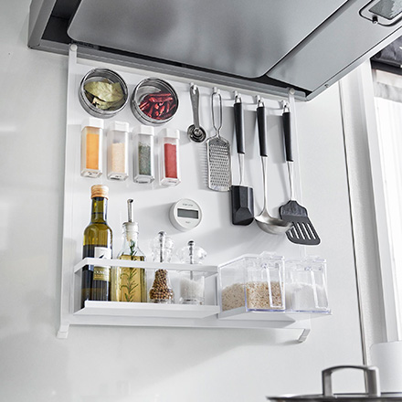 コンロ周りの壁面を有効活用!マグネット収納空間に変える大判スチールパネル