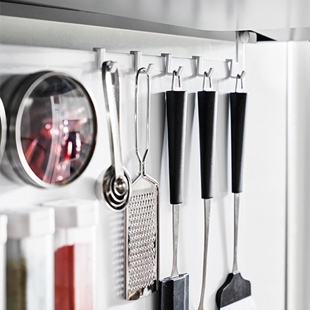 - 付属のフックにキッチンツールを掛けて収納できるので、調理中すぐに手に取れて便利です。