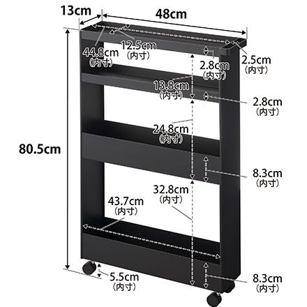 | サイズ/寸法 | 商品サイズ:幅13×奥行48×高さ80.5cm(キャスター含む) 内寸サイズ:1段:幅12.5×奥行44.8×高さ2.8cm / 2段:幅12.5×奥行44.8×高さ13.8cm / 3段:幅12.5×奥行44.8×高さ24.8cm / 4段:幅12.5×奥行44.8×高さ32.8cm |