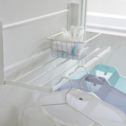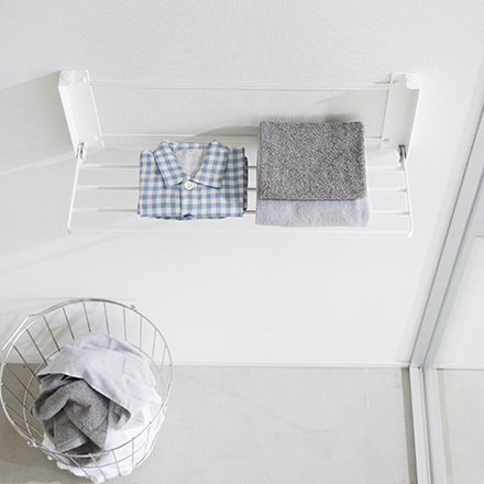 幅65.5cmのワイドサイズ。物を置いたりバスタオルや洗濯物も干せる折り畳みラック。