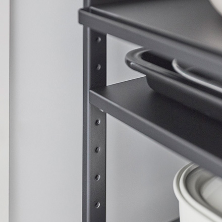 収納するキッチンアイテムに合わせて調節できるので、薄型のカッティングボードやトレイ、オーブンのプレートなどのオプションパーツもデッドスペースを作ることなくぴったり収納できます。