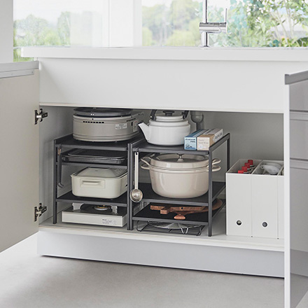 約2.5cm刻みで細かく高さが調節できるのでホットプレートやカセットコンロなどを無駄なく収納できます。
