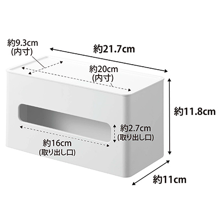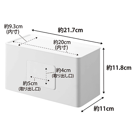 | サイズ/寸法 | 本体:約幅21.7×奥行11×高さ11.8cm ソフトパックティッシュ収納部:約幅21×奥行5×高さ10.8cm ウェットシート収納部:約幅16.5×奥行4×高さ10.8cm トレー部:約幅20×奥行9.3cm ティッシュ取り出し口:約幅16×高さ2.7cm ウェットシート取り出し口:約幅5×高さ4cm |