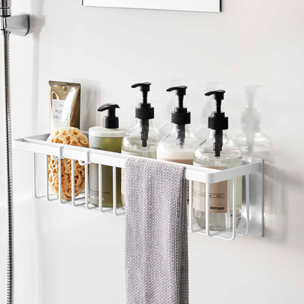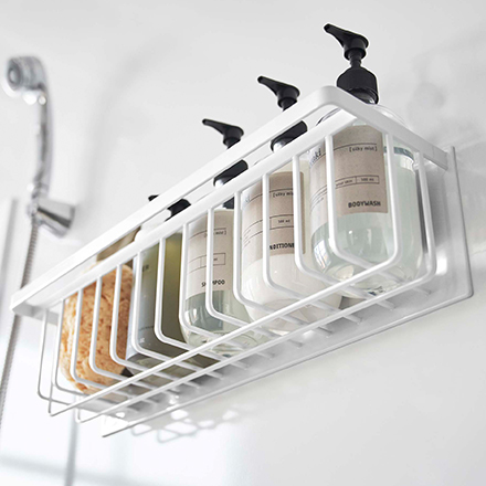 ディスペンサーボトル・チューブを並べて収納。手前のバーにはタオルなどを掛けられます。