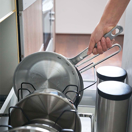 フライパンを使いやすく立てて収納可能。