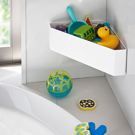 バスルームのコーナーにマグネットで簡単に取り付けができるおもちゃラック