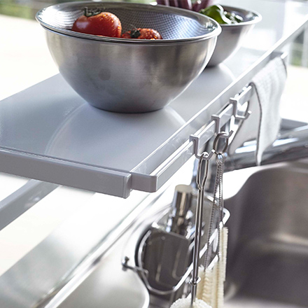 調理エリアに水まわりエリア・加熱調理エリアとそれぞれの場所でキッチン作業のサポートをしてくれる便利なキッチンラック。