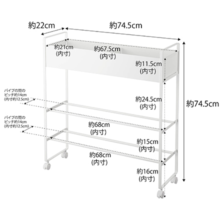 | その他詳細 3 | 内寸:バスケット:約W67.5×D21×H11.5cm ボール収納部上段:約W68×D14(パイプ間のピッチ)×H24.5cm ボール収納部下段:約W68×D14(パイプ間のピッチ)×H15cm 床から下段まで:約H16cm |