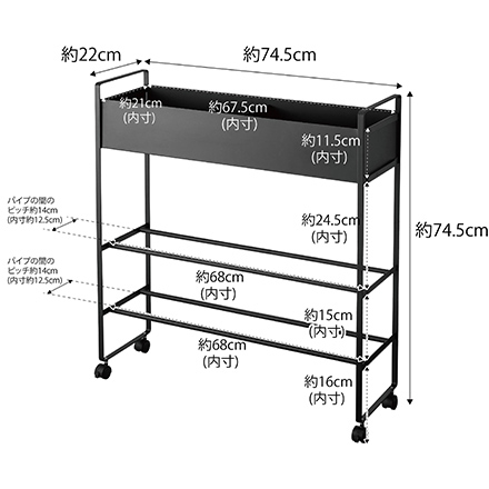 | その他詳細 3 | 内寸:バスケット:約W67.5×D21×H11.5cm ボール収納部上段:約W68×D14(パイプ間のピッチ)×H24.5cm ボール収納部下段:約W68×D14(パイプ間のピッチ)×H15cm 床から下段まで:約H16cm |