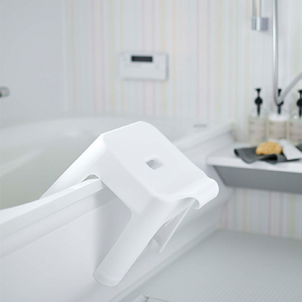 バスカウンター付き浴室に最適な座面の高さ30cmタイプ。背もたれ付きでゆったり座れます。シャワーフックにも掛けられるプレート付き。お風呂の縁や、浴室の物干しバーや、浴室の扉のハンドルに引っ掛けて乾かせます。