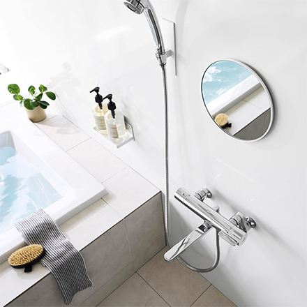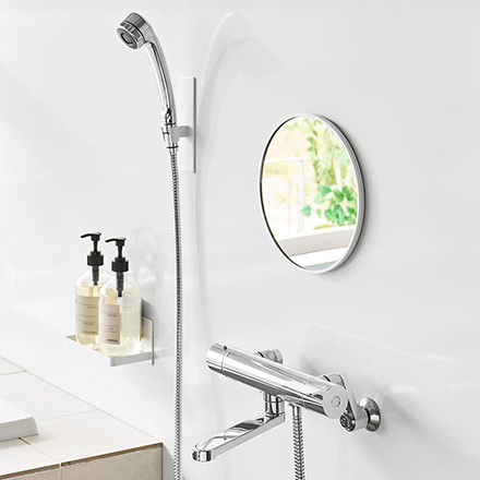 ・おしゃれな丸型ミラーで、印象的でスタイリッシュなバスルームを演出します。
