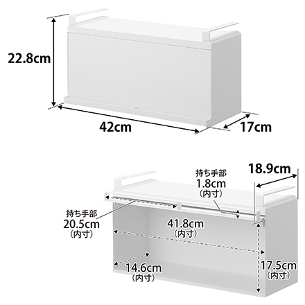| サイズ/寸法 | 約幅42×奥行17×高さ22.8cm 扉開口時:約奥行18.9cm 収納部:約幅41.8×奥行14.6×高さ17.5cm(有効内寸・ローラー部含まず) |