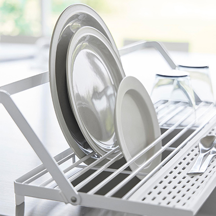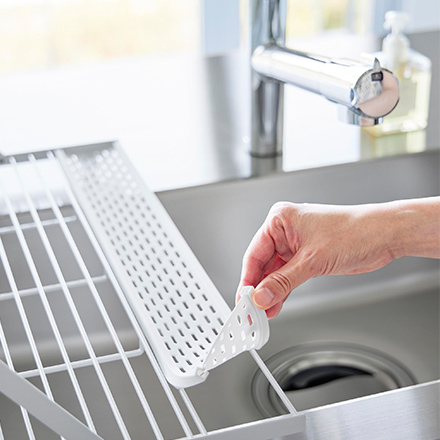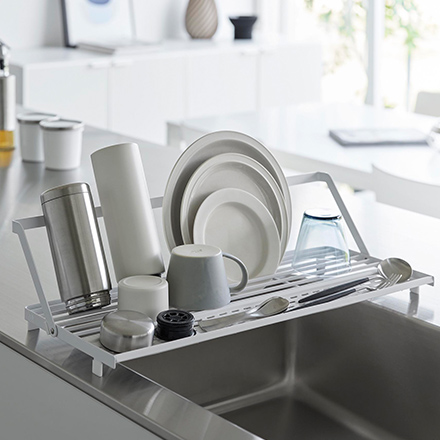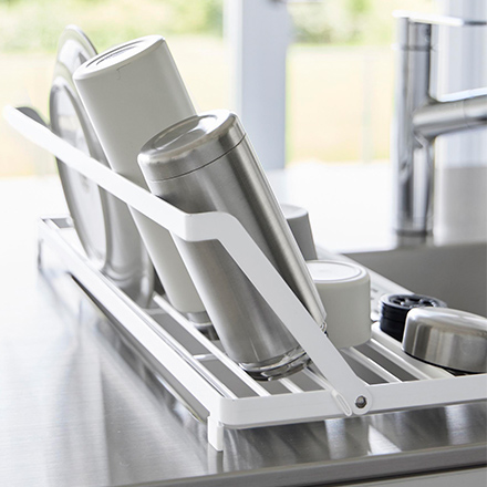 可動式スタンドバーを立ててジャグボトルやまな板、お皿などを立てて乾かせる多機能水切りラックです。小物も置けるシリコーントレー付き。