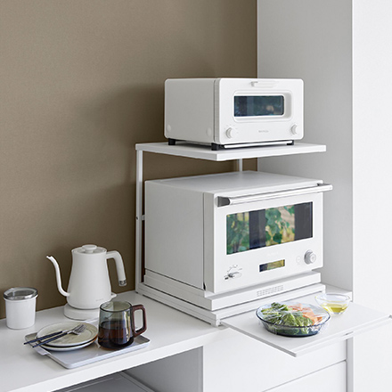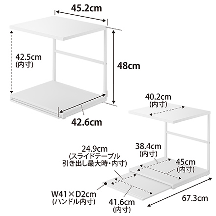 | サイズ/寸法 | 本体:約幅45.2×奥行42.6~67.3×高さ48cm 上棚:約幅45.2×奥行40.2cm 置き台:約幅45×奥行38.4×高さ42.5cm スライドテーブル:約幅41.6×奥行24.9cm(引き出し時最大) |