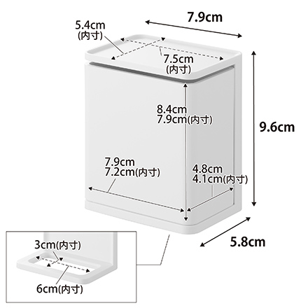 | サイズ/寸法 | 本体:約幅7.9×奥行5.8×高さ9.6cm(フィルムフック含まず) 容器:約幅7.9×奥行4.8×高さ8.4cm フィルムフック接着面:約幅6×高さ6cm |