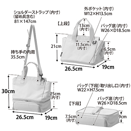 | サイズ/寸法 | 幅26.5×奥行19×高さ30cm(持ち手・ショルダーストラップ含まず) バッグ(上段):幅26.5×奥行19×高さ21cm バッグ(下段):幅26.5×奥行19×高さ9cm |