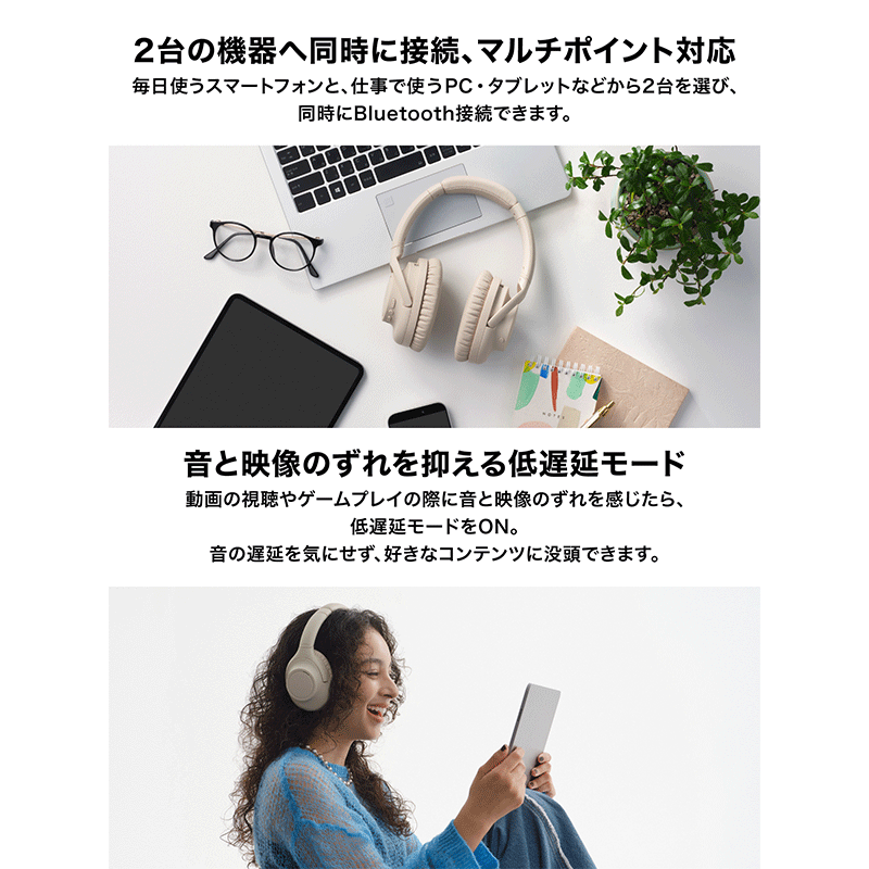例えば、スマートフォンで音楽を聴きながら仕事、Web会議の時間になったらペアリングし直す手間なく、接続しているPCで即座に対応できます。