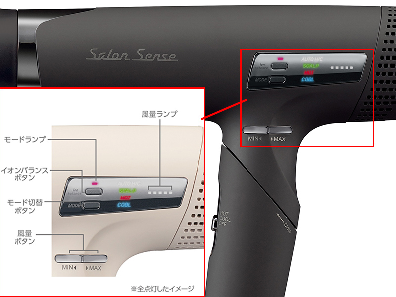 わかりやすい操作パネルで風量調節や、温冷自動切替、スカルプなどのモード状態をわかりやすく表示。