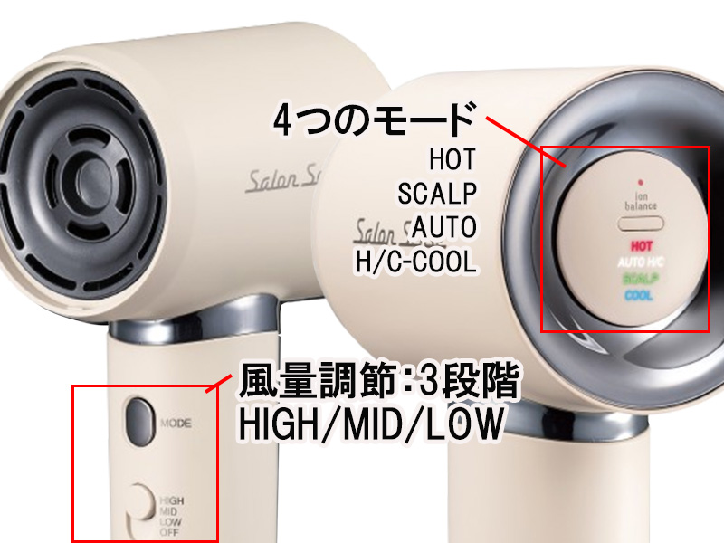 | その他詳細 3 | メインスイッチ:HIGH-MID-LOW-OFF その他スイッチ:イオンバランスボタン:(ON-OFF) モード切替:HOT-SCALP-AUTO H/C-COOL 風量調節:3段階(HIGH/MID/LOW) その他機能:着脱式吸込口フィルター |