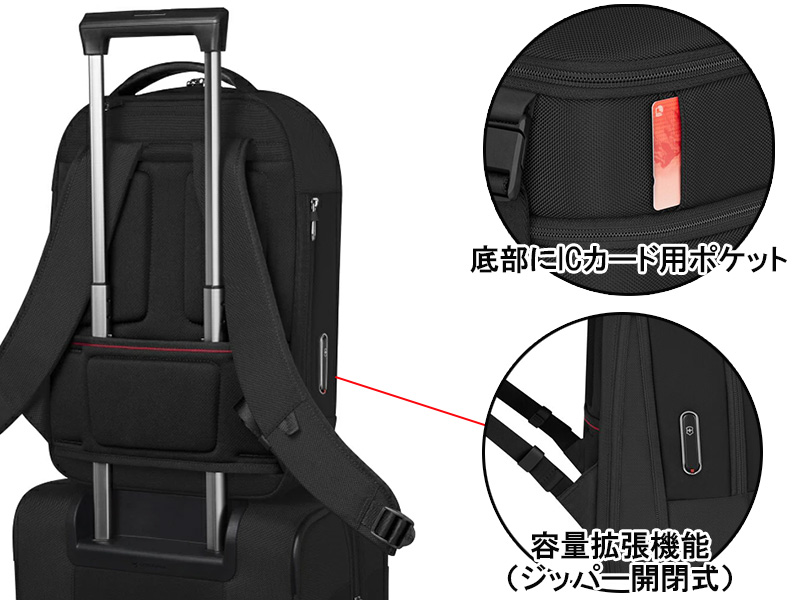 (背面上) 隠しジッパーポケット x1、トロリースリーブ、ICカード用ボトムポケット x1、パーソナライゼーション可能マルチツールハンドル x1