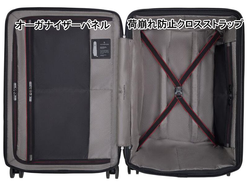 ジッパーディバイダーに各種ポケットを備えたオーガナイザーパネル(左)、荷崩れ防止クロスストラップ(右)。