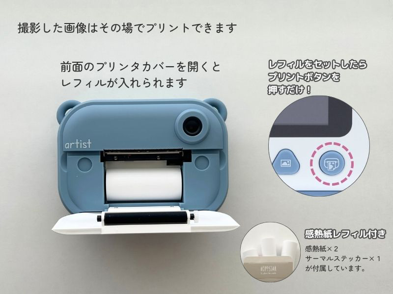 プリント用のレフィル3本(感熱紙2本、サーマルステッカー1本)付きです。