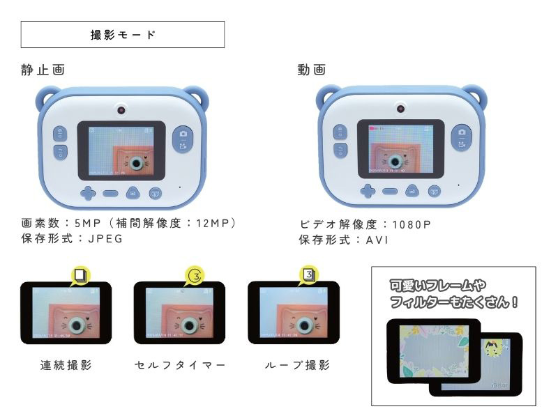 静止画は画素数500万pixel(補間解像度1200万pixel)、動画はビデオ解像度1080pixelと十分に楽しめる画質で、静止画は連写やセルフタイマー、フレームやフィルターが使用できます。