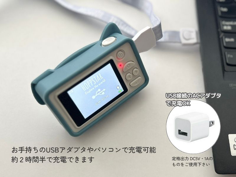 カメラ側は汎用性の高いtype-c、電源側はUSBでお手持ちのACアダプタ(定格出力 DC5V・1A)やパソコンで充電可能です。