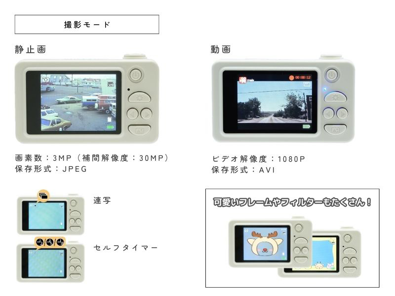 静止画は画素数300万pixel(補間解像度3000万pixel)、動画はビデオ解像度1080pixelと十分に楽しめる画質で、静止画は連写やセルフタイマー、フレームやフィルターが使用できます。