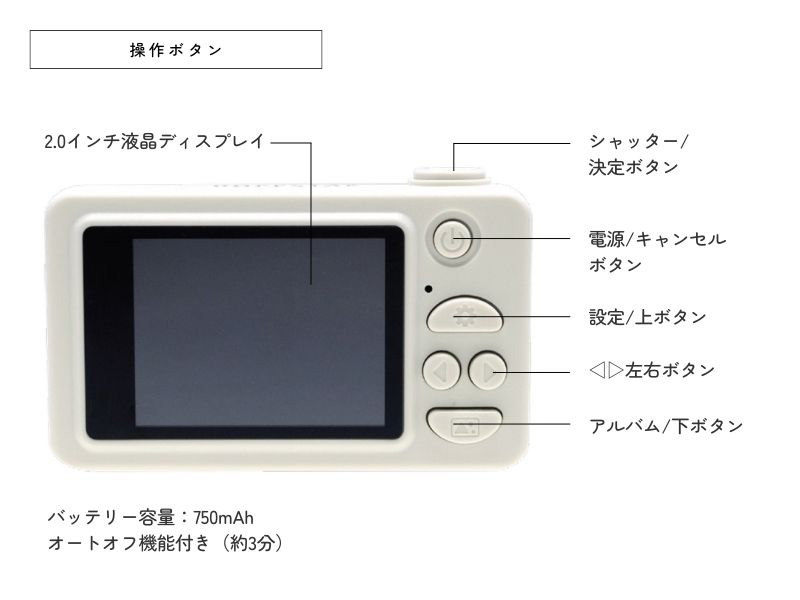 | その他詳細 2 | ディスプレイサイズ:2.0インチ 静止画画素数:3MP(補完解像度:30MP) ビデオ解像度:1080P バッテリー容量:750mAh |
