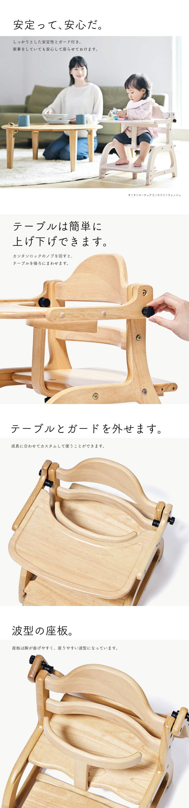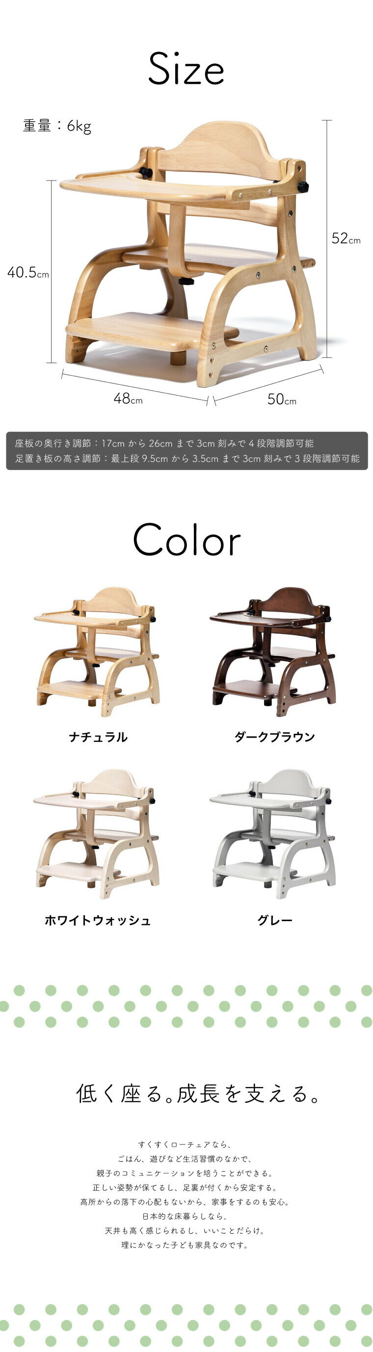 | サイズ/寸法 | ●サイズ:約幅48×奥行き50×高さ52cm 床からテーブル上部まで約41.5cm ●詳細サイズ :座板奥行き 17、20、23、26cm(4段階調整) 足置き板の高さ :9.5、6.5、3.5cm(3段階調整) |