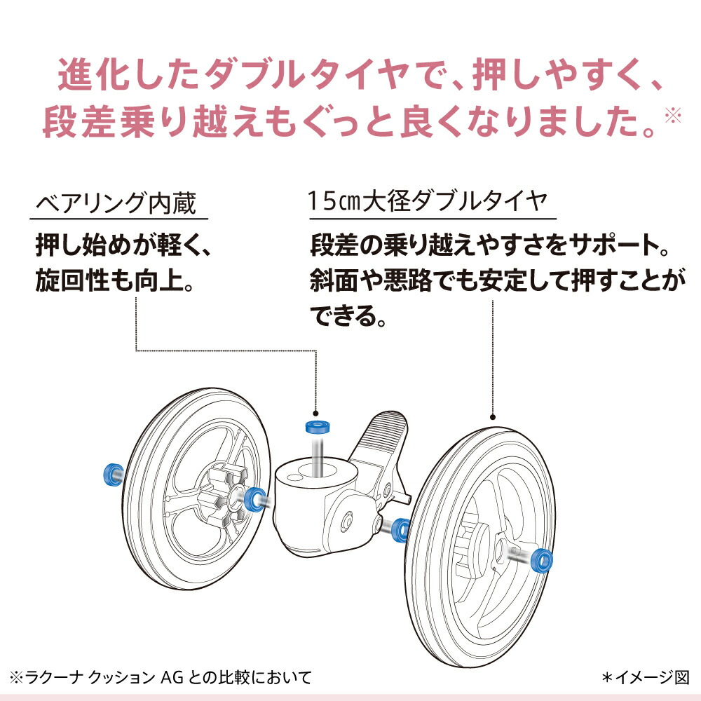 ―車軸を安定させ回転摩擦抵抗を少なくするベアリングを車輪あたり5個、合計20個も内蔵。押し始めが軽く、旋回性も向上。