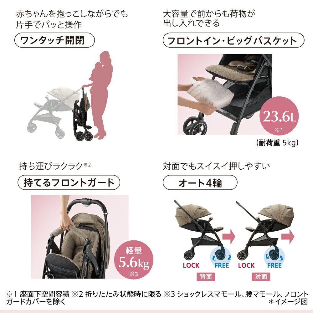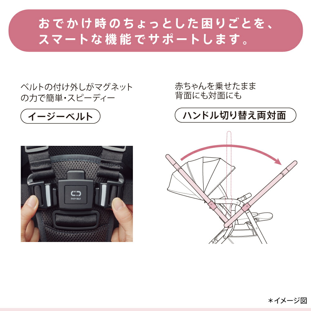 ●赤ちゃんを乗せたままでもハンドル切り替えができる「ハンドル切り替え両対面」、持ち運びラクラク「持てるフロントガード」、片手でパッと折りたたみできる「ワンタッチ開閉」、大容量で前からも荷物を出し入れできる「フロントイン・ビックバスケット」、などお出かけの負担を減らすママのカンタン&ベンリな機能充実。