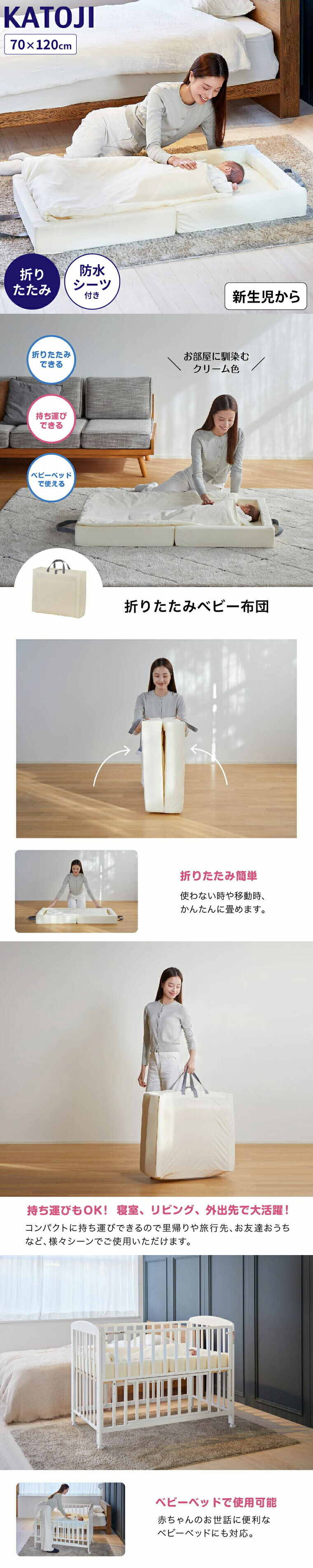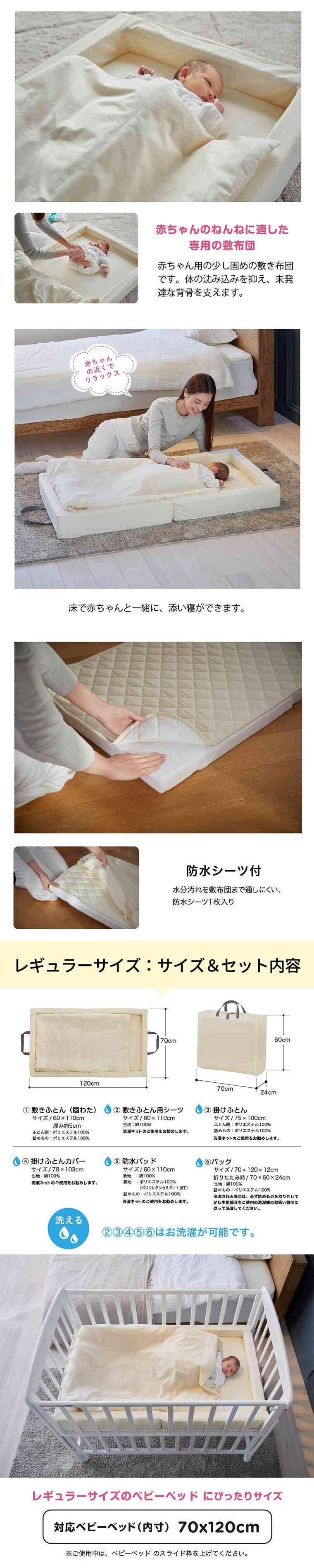 | サイズ/寸法 | W60×D110×H5cm(敷き布団) W60×D110cm(フィットシーツ) W60×D110cm(防水パッド) W70×D120×H12cm(バッグ) W70×D60×H24cm(バッグ折りたたみ時) W75×D100cm(掛け布団) W78×D103cm(掛け布団カバー) |