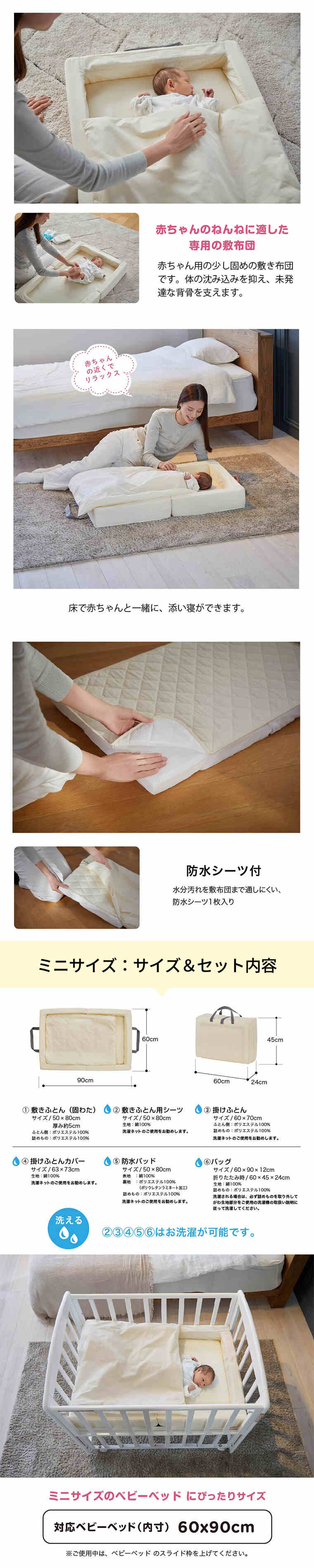 | サイズ/寸法 | W50×D80×H5cm(敷き布団) W50×D80cm(フィットシーツ) W50×D80cm(防水パッド) W60×D90×H12cm(バッグ) W60×D45×H24cm(バッグ折りたたみ時) W60×D70cm(掛け布団) W63×D73cm(掛け布団カバー) |