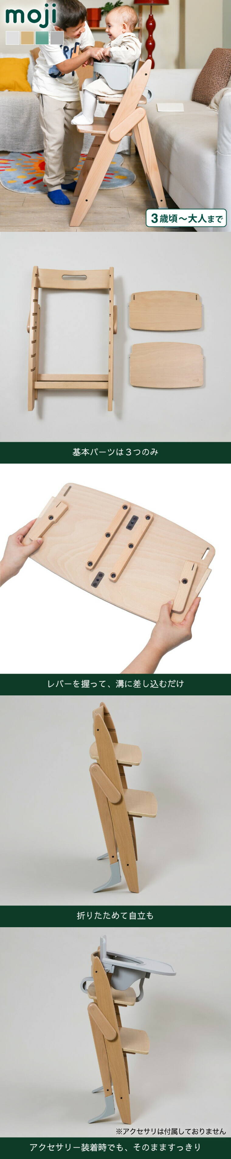 離乳食から、お料理のお手伝い、リビング学習、そしてキッチンでの腰かけやカウンターチェア、来客用のサブチェア等、様々なシーンで活躍する家族みんなのチェア。